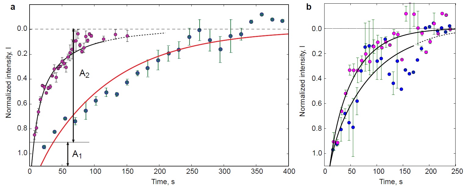 Figure 5: FRAP data fitted with a two-exponential equation. Averaged normalised data with error bars and approximation curves are plotted for each experiment. The determination coefficient (R2) is presented for each group of observations, as well as the weight of the fast exponent, αâ=âA1/A2 (as shown in Fig. 4); this value reflects the ratio of free-to-adsorbed protein (analysis details are described in Supplementary Materials and Methods, 1.3). |