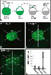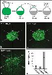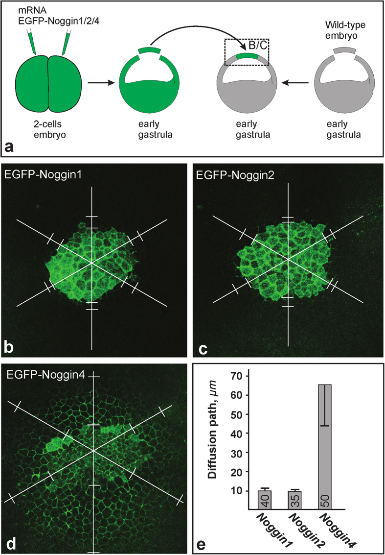 Figure 3: Diffusion of EGFP-Noggin1/2/4 from the ectodermal grafts. (a) Experimental design. The region that corresponds to images (bâd) is framed by a dashed rectangle. (bâd) Representative examples of the grafts 1 hour after transplantation. Note that in contrast to recipient embryo cells, graft cells contain EGFP-Noggin1/2/4 in the cytoplasm. To compare the diffusibility of the EGFP-Noggin1/24, the diffusion path (DP) was measured for each graft in six directions (white lines radiated under 60 degrees from the approximate centre of the graft), beginning from the graft border until the point at which the EGFP fluorescence level in an IS became equal to the background fluorescence level in the donor IS (pairs of white bars perpendicular to the radial lies). (e) Medium DP and deviation calculated for all grafts per type (number of grafts is indicated within each column). |