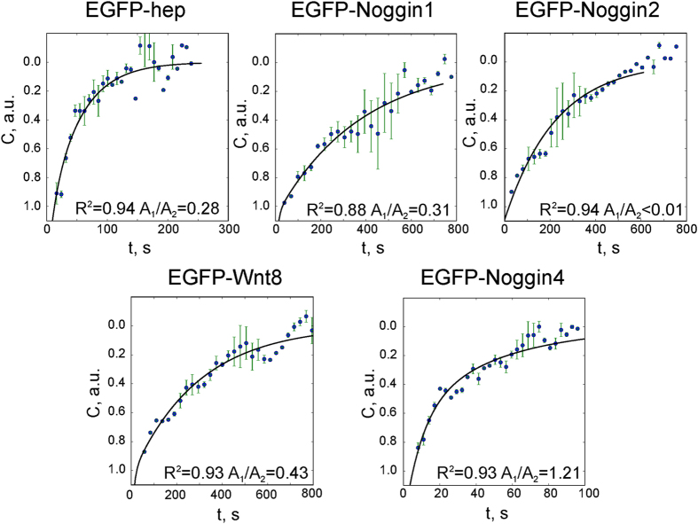 Figure S10. FRAP data fitted to the equation (S1.2). Averaged normalised data with error bars and approximation curves are plotted for every experiment. The determination coefficient (R2) is presented for every group of observations. The lowest coefficient of variation (CV) of parameter D calculated for every separate measurement was observed for EGFP-Noggin4. |