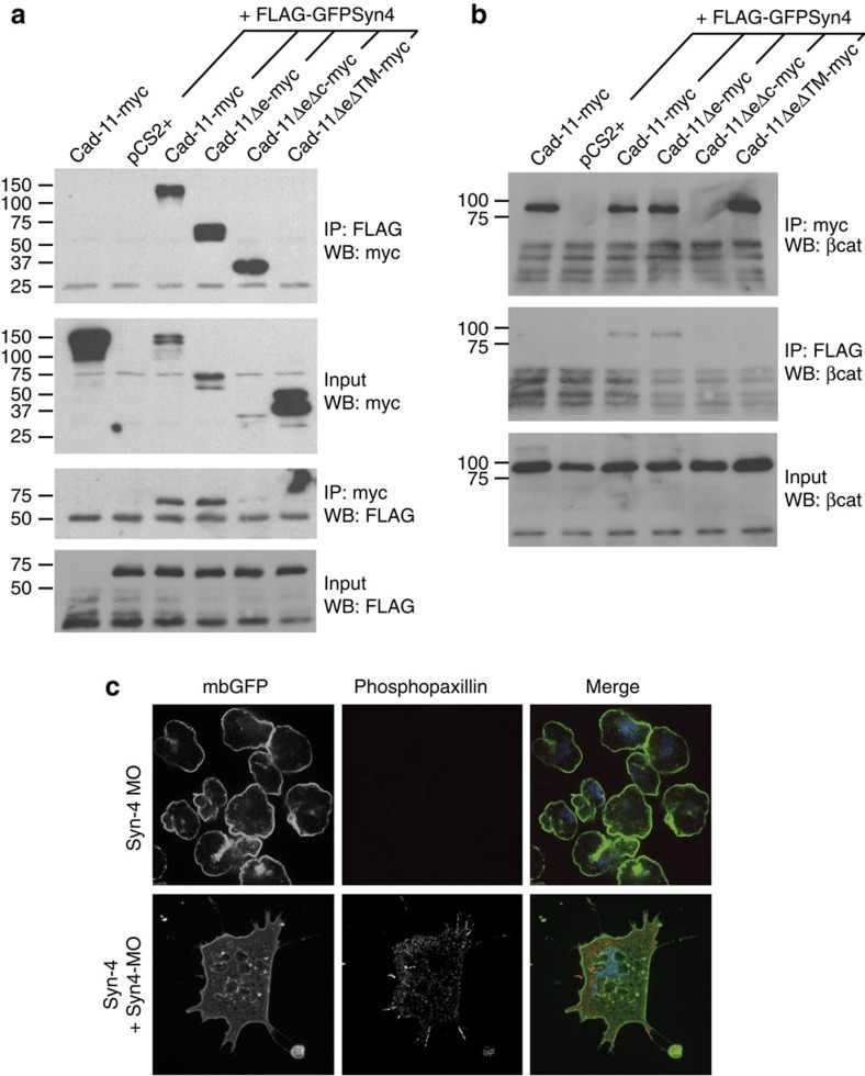 Figure 3. Syn-4 interacts with Xcad-11 and stimulates focal adhesion formation.(a) Co-immunoprecipitation of Syn-4 with different Xcad-11 constructs. (First row) Precipitation of Syn-4 with FLAG antibody from transfected HEK293 cells. Western blot for Xcad-11 (myc) showed successful co-precipitation of Xcad-11, Xcad-11 δe and Xcad-11 δeδc. In the case of Xcad-11 δeδTμ and pCS2+, no co-precipitation with Syn-4 was detected. (Second row) Input for the different Xcad-11 constructs was detected by western blotting. (Third row) Precipitation of different Xcad-11 constructs with myc antibody from transfected HEK293 cells. Western blot for Syn-4 (FLAG) showed successful co-precipitation of Xcad-11, Xcad-11 δe and Xcad-11 δeδc. In the case of Xcad-11 δeδTμ and pCS2+, no co-precipitation with Syn-4 was detected. (Fourth row) Input for Syn-4 was detected by western blotting. Transfection of Xcad-11 alone served as negative control (first panel). (b) Co-immunoprecipitation of Syn-4 with different Xcad-11 constructs analysed for β-catenin (βcat) binding. (First row) Precipitation of different Xcad-11 constructs with myc antibody from transfected HEK293 cells. Western blot for βcat showed successful co-precipitation of Xcad-11, Xcad-11 δe and Xcad-11 δeδTμ . In the case of Xcad-11 δeδc and pCS2+, no co-precipitation with βcat was detected. (Second row) Precipitation of Syn-4 with FLAG antibody showed successful co-precipitation of βcat when Xcad-11 or Xcad-11 δe were co-transfected. (Third row) Input for βcat was detected by western blotting. Transfection of Xcad-11 alone served as negative control (first panel). (c) NCC explants co-injected with mbGFP and Syn-4 MO and immunostained for phosphopaxillin. Depletion of Syn-4 leads to loss of phosphopaxillin staining, which is rescued by co-injection of Syn-4. Scale bars, 20âμm.