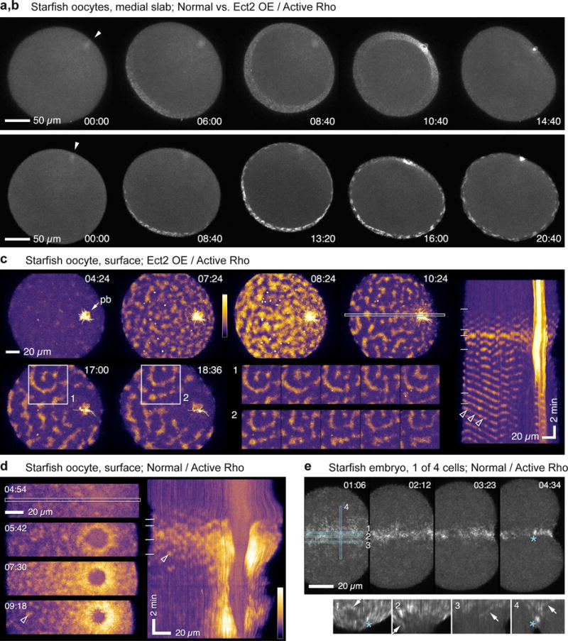 Figure 3. Rho activity waves in starfish oocytes and embryos. (a,b) Frames from time-lapse sequences of Rho activity during meiosis I in normal starfish oocyte (top; projection of 8 1 micron sections) and oocyte overexpressing wild-type S. purpuratus Ect2 (bottom; projection of 8 1.5 micron sections). See Supplementary Video 6. Arrow indicates animal pole. Rho activity appears at vegetal pole, spreads upward, and converges on nascent polar body, forming cytokinetic Rho zone. In Ect2-expressing oocytes the global pattern of Rho activity mirrors that of controls but waves are much brighter, travel further, and persist after polar body emission. (c) Surface view of cortical Rho activity in meiosis II oocyte overexpressing Ect2 (see Supplementary Video 7; pb = polar body; projection of 14 1 micron sections). High amplitude waves form and settle into repetitive, often spiral, patterns. Inset montages are successive 60 s time points from boxed region on left starting at 17:00 (1) or 18:36 (2), showing patterns that approximately replicate on ~ 70 sec time scale (1 is spiral, 2 is center-surround with a slash underneath). Kymograph on right generated from area indicated by outlined strip, 4th frame. Diagonal bands span half the oocyte, showing that waves travel at least this far. Horizontal lines in kymograph mark times of frames shown on left. Arrowheads point to wave front that traverses tens of microns at steady speed (d). Surface view of cortical Rho activity in normal starfish oocyte, single frames (left) and kymograph (right). Rho waves appear, brighten, and coalesce into continuous zone around nascent polar body (see Supplementary Video 8). Arrowheads indicate wavelet that appears in both kymograph and still frame. (e) Rho activity in normal starfish blastomere (1 of 4 cells), still frames and kymographs generated from strips outlined in blue: 1, furrow center; 2, furrow periphery; 3, just outside furrow; 4, across furrow. Rho waves focus at equator before ingression, appear in the furrow (arrows), and eventually merge into a coherent Rho zone. Asterisk indicates particularly bright focus that appears in 4th still frame and kymographs 1 and 4. Images are representative of 10 (a, d), 20 (b, c) and 4 (e) independent experiments, respectively. |