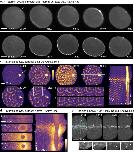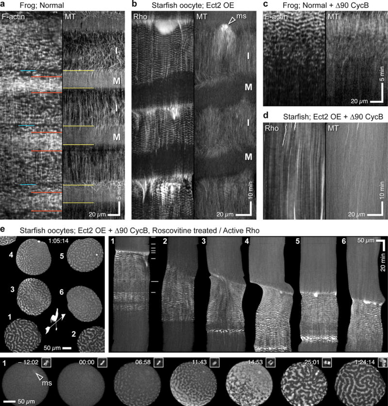 Figure 6. Cdk1 gates excitability. (a) Kymograph from normal frog embryo showing waves of cortical F-actin (left) and cortical microtubules (right). I=Interphase; M=M-phase; Yellow lines on right indicate M-phase onset, as revealed by loss of cortical microtubules. Actin waves persist throughout M-phase but wave density varies: at M-phase onset (blue line on left), waves are spaced farther apart; this is followed by period of same length as M-phase but slightly delayed in which F-actin waves are brighter (red lines). (b) Kymograph from double-labeled starfish oocyte overexpressing Ect2 showing waves of cortical Rho activity (left) and cortical microtubules (right). Rho waves cease in each M-phase and reappear in each interphase. ms = meiotic spindle. (c) Kymograph of frog blastomere expressing Δ90 cyclin B showing cortical F-actin (left) and cortical microtubules (right). As time of high Cdk1 activity lengthens (revealed by loss of cortical microtubules) cortical F-actin waves progressively disappear. (d) Kymograph of Ect2-overexpressing starfish oocyte expressing Δ90 cyclin B as well, showing cortical Rho activity (left) and cortical microtubules (right). Rho waves fail to appear as cell remains arrested with high Cdk1 activity. (e) Top left: Rho activity in starfish oocytes overexpressing Ect2 and expressing Δ90 Cyclin B, 65 min after treatment with 40 μM roscovitine to inhibit Cdk1 (see Supplementary Video 16). Weather vane indicates direction of roscovitine flow. Roscovitine-containing seawater perfused around tight-packed oocytes from Southeast to Northwest at time 00:00; cells 1 and 2 are at cluster edge, cells 5 and 6 are in cluster center; hence, weathervane indicates presumed gradient of drug exposure. All oocytes show robust Rho waves at this time point. Top Right: kymographs of oocytes (identified by numerals) showing development of cortical Rho activity waves following Roscovitine treatment. Note that onset of waving follows expected rate of Cdk1 inhibition based on access to drug in perfused media. Bottom: successive frames showing oocyte 1 alone; inset shows chromosomes, arrowhead indicates position of meiotic spindle. Rho waves are well developed at least five minutes before anaphase begins. Images are representative of 4(a), 3(b), 5(c) and 6(d) independent experiments, respectively. |