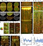 Figure 4. F-actin assembly fronts directly follow, but overlap minimally with, Rho activity waves. Color table shown in (b) applies to all images in this figure. (a) Normal starfish blastomere co-expressing GFP-rGBD (malachite; Rho activity) and GFP-Utr (copper; F-actin), selected frames (top) from time-lapse sequence of cytokinesis (Supplementary Video 9), and raw and subtracted kymographs (bottom) made from outlined strip. In still images, cytokinetic furrow is populated by apparently random densities of active Rho and F-actin; kymographs show these correspond to wavelets in which Rho activity rises, then falls as actin assembles. (b) Still images (left) and kymographs (right) from time-lapse movie of cortical F-actin and Rho activity in frog embryo showing two cells (1, 2) undergoing cytokinesis. Rho waves in furrow are followed by F-actin assembly waves. (c) Rho activity and F-actin in a starfish oocyte modestly overexpressing wild-type Ect2; kymograph (bottom) made from strip outlined in still frame (top). See Supplementary Video 10. Except during the global burst of Rho activity accompanying each meiotic cytokinesis, Rho activity waves immediately precede F-actin assembly, and F-actin disassembly precedes each Rho activation wave. Inset magnifies 4 cycles from wave train after first meiosis, emphasizing minimal overlap (yellow) between malachite and copper, and dark zone separating copper from next malachite wave. (d) Activated frog egg subjected to Ect2 overexpression, probes and presentation as in 4c (see Supplementary Video 11). Although waves are more tightly packed in frog eggs, kymographs show strikingly similar relationship between Rho and actin waves as in normal starfish. (e) Starfish zygote overexpressing Ect2 (see Supplementary Video 12), probes and presentation as in 4c and 4d, positions of still frames (left) indicated by dashes in kymograph (right). Faint waves precede global rise in Rho activity that focuses equatorially, leaving lower-amplitude waves in non-furrow regions; throughout, F-actin assembly follows peak Rho activity, and dark phases precede each Rho wave. (f) Temporal correlation plot of Rho waves from starfish oocytes overexpressing Ect2. Wave period ~80s. (g) Spatial correlation plot of Rho waves from starfish oocytes overexpressing Ect2. Wavelength 18 μm. Images are representative of 4 (a, b) 8 (c), or 5 (d) independent experiments, respectively. |