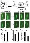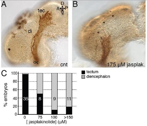 Figure 4- RGC axons fail to navigate the midâdiencephalic turn in the presence of the actin stabilizer, jasplakinolide. A,B: X. laevis brains were exposed to control or jasplakinolide solutions from stage 33/34 to stage 40. C: Graph showing the percentage of embryos with optic tracts that reached the optic tectum (tectum), or failed to navigate the turn in the diencephalon (diencephalon). Number of brains analyzed for each condition indicated within the bars.