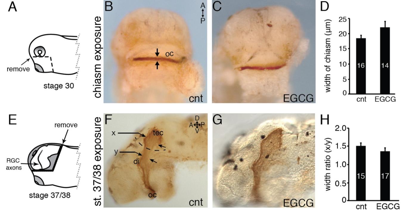 Figure 5-RGCaxon navigation at the optic chiasm and into the tectum is unaffected by EGCG. A: Schematic indicating the exposure technique for RGC axons at the optic chiasm. B,C: Developing RGC axons were exposed to control or 25 μM EGCG as they crossed the optic chiasm. Arrows in B illustrate chiasm width measurement. D: Graph comparing the width of the optic chiasm in control and EGCGâtreated embryos. E: Schematic illustrating the position of leading RGC axons for the stage 37/38 exposure. F,G: X. laevis brains were exposed to control or 25 μM EGCG solutions during the period of RGC extension into the optic tectum. Arrows in F illustrate the width ratio (x/y) measurements. H: Graph comparing the width ratio for control and EGCGâtreated embryos. For both D and H, the number of brains analyzed for each condition are indicated within the bars. A minimum of three experiments was performed for each condition. Data are mean ± SEM. Analysis: A Student's tâtest was used to compare control and 25 μM EGCGâtreated groups, and no significant difference was found for the chiasm width (P = 0.07) or the width ratio (P = 0.16). A, anterior; D, dorsal; di, diencephalon; oc, optic chiasm; P, posterior; rgc, retinal ganglion cell; tec, optic tectum; V, ventral. Dashed line in F indicates approximate anterior tectal boundary.
