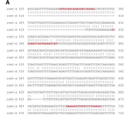 Fig. 2.Temporal expression and comparison of rnmt paralogs. (A) The nucleotide sequence of the fragment used to compare spatial expression of rnmt-a and -b is shown. Sequences used for primer pairs are in red. Intron spanning primers were used to exclude any contamination from genomic DNA. Primer pairs, specific to each of both loci were used to compare the temporal expression of the paralogs.