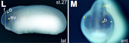 rnmt (RNA (guanine-7-) methyltransferase) gene expression in Xenopus laevis embryo, assayed via in situ hybridization, NF stage 27 (L): lateral view, anteriorleft, dorsal up, and (M) anterior view, dorsal up.