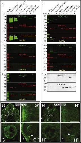 Fig. 4. Specificity of intermediate filament protein antibodies. Western blots were used to determine the specificity of GFAP pAb (A), GFAP mAb (B), Prph pAb 1 (C), Prph pAb 2 (D), Vim mAb (E), and R5 mAb (F). Extracts were prepared from embryos injected with mRNA coding for the indicated myc-tagged IFP. Blots were probed with the indicated combination of primary antibodies. Green fluorescent secondary antibodies were used to detect the IFP and myc primary antibodies, respectively (A-E). Red fluorescent signals were pseudocolored to make visualization easier. Merged images indicate myc-IFP proteins detected by both antibodies (AâE, yellow). Enhanced chemiluminescence was used to test the specificity of the R5 mAb and myc pAb (F). One-sixth the volume of extract from myc-MmGFAP expressing embryos in lane 2 was used in lane 3. Immunohistochemistry was use to compare the staining pattern of the GFAP pAb (G-Gâ²â²â²) and GFAP mAb (H-Hâ²â²â²) in sections of stage 35/36 X. laevis embryos. Gâ²/Hâ², Gâ²/Hâ² and Gâ²â²â²/Hâ²â²â² show magnified views of the brain, notochord and retina, respectively. Arrow and arrowheads, indicate the location of skin epidermis and ocular motorneuron projections dorsal and ventral to the optic cup, respectively. Scale bar, 50 µm. |