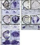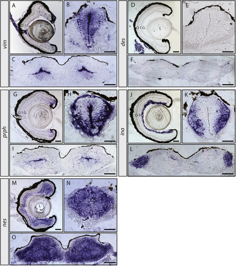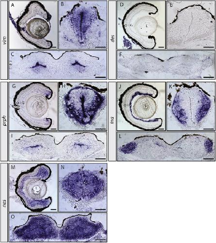 Fig. 5. Expression patterns of vim, des, prph, ina, and nes in the pre-metamorphic tadpole nervous system. In situ hybridization on retinal, brain and spinal cord sections for vim (AâC), des (DâF), prph (G-I), ina (JâL), and nes (MâO). Sections were obtained from pre-metamorphic stage 50 tadpoles. Location of the lens (L), outer (O), inner (I) and ganglion (G) cell layers are indicated. Scale bars, 100 µm in A, D, G, J and M; all others are 50 µm. |