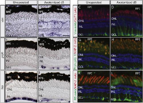 Fig. 7. Retinal expression of intermediate filament proteins after retinal ganglion cell axotomy. vim (A and B), prph (E and F), and ina (I and J) in situ hybridization on retinal sections from control unoperated (A, E, and I) and operated (retinal axotomy) (B, F, and J) eyes. Vim mAb (C and D), Prph pAb 1 (G and H), and R5 mAb (K and L) immunolabeling of retinal sections from control (C, G, and K) and operated (D, H, and L) eyes. Rod photoreceptors were labeled with either GαT1 (Transducin) pAb (C and D) or XAP-2 mAb (G, H, K, and L). Sections were counterstained with DAPI to visualize nuclei. Scale bars, 50 µm. |