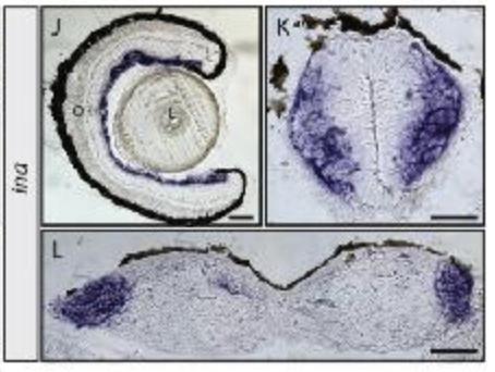 ina (internexin neuronal intermediate filament protein alpha) gene expression in Xenopus laevistdpole, seen in eye (J), brain (L) and spinal cord (K) sections , at NF stage 50. |