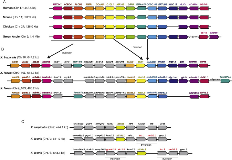 Fig. 3. Syntenic analyses of gfap genomic regions. The genomic regions surrounding gfap genes in select vertebrates are illustrated. For clarity, homologous genes have been similarly colored. Non-coding RNAs and pseudogenes were not included. Although human FAM187a is not annotated on the most recent reference assembly (GRCh38), it was included on previous assemblies and its location is included here. Chromosome number as well as the size of the regions depicted in the schematic are shown in parenthesis. The reverse complement of sequences were used so the gfap gene appears 5′ (left) to 3′ (right) in all species. The location of hypothesized deletions, duplications and inversions are also illustrated. The sequence source and locations used to build these syntenic schematics can be found in Table S4. |