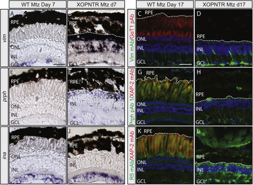 Fig. 6. Retinal expression of intermediate filament proteins after rod photoreceptor ablation. vim (A and B), prph (E and F), and ina (I and J) in situ hybridization in retinal sections from wild-type (A, E, and I) and XOPNTR (B, F, and J) tadpoles treated with Mtz for 7 days. Dashed white lines indicate the boundary between the RPE (dark pigment) and neural retina. White asterisks in B and F indicates expression of vim (B) and prph (F) adjacent to the RPE in the subretinal space. Immunolabeling of retinal sections with anti-Vim mAb (C and D), Prph pAb 1 (G and H), and R5 mAb (K and L) in Mtz-treated wild-type (C, G, and K) or XOPNTR (D, H, and L) retinas. Retinal sections were co-stained with DAPI to visualize nuclei. Scale bars, 50 µm. |
