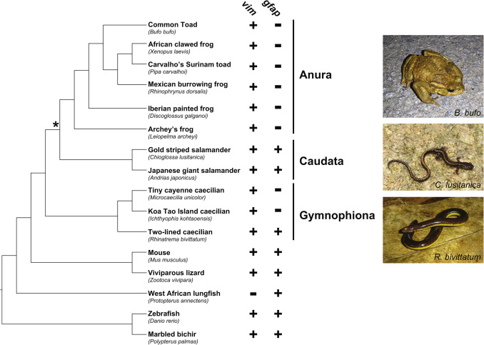Fig. 8. Schematic representation of the evolutionary relatedness of species in the survey for gfap and vim genes. Orders for amphibian species are indicated. Asterisk illustrates last common ancestor shared by Anura and Caudata. + and â indicate presence or absence of indicated gene in the PCR surveys, respectively. Photo credits: B. bufo, R. bivittatum (DSM), C. lusitanica (Benny Trapp: https://commons.wikimedia.org/wiki/User:Benny_Trapp). |