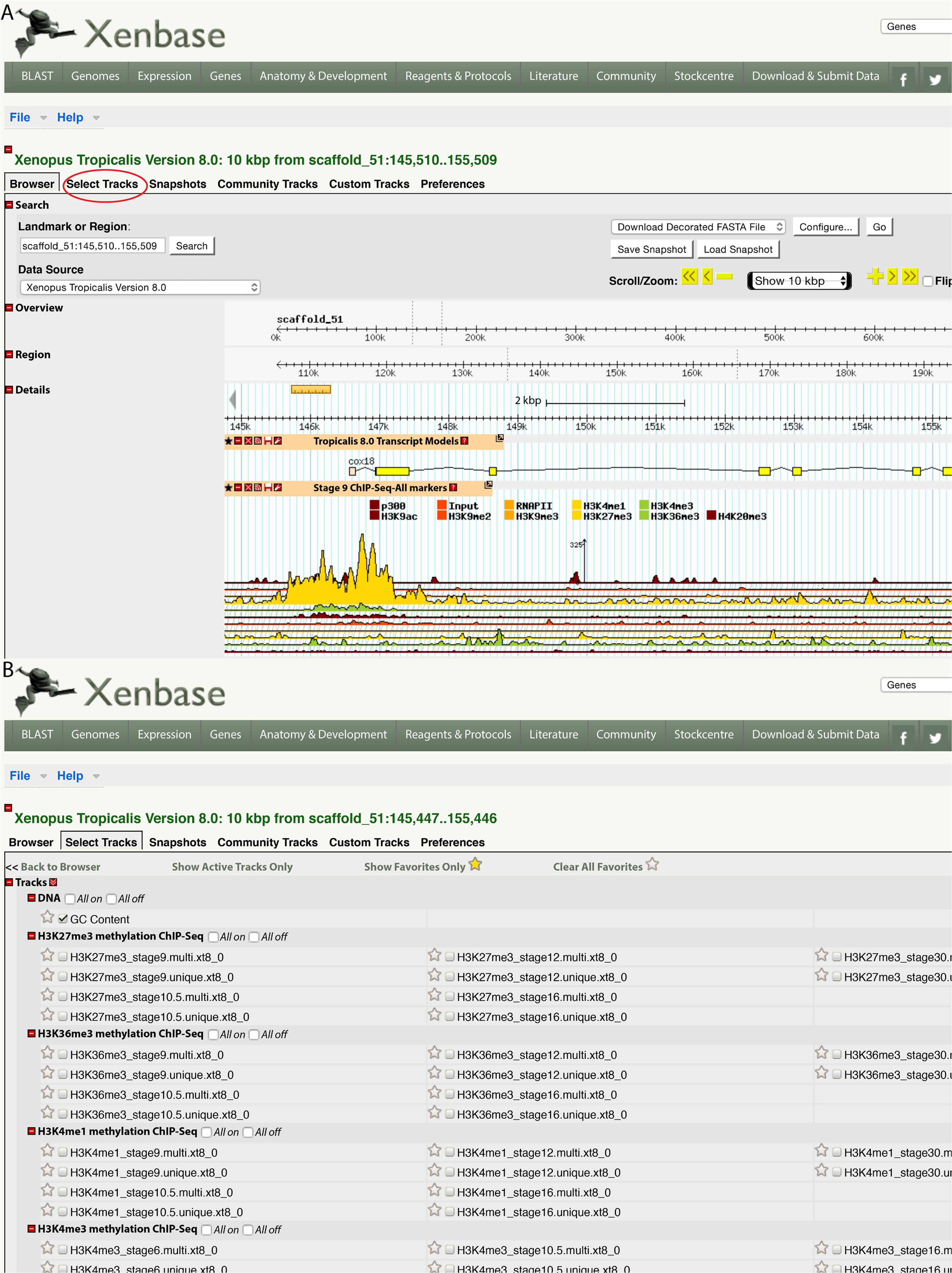 Xenbase GBrowse with NGS data. A. The default view of the cox18 gene in Xenbase, with multiple NGS tracks displayed in a stacked format using a tool called Topoview, developed by FlyBase (http://flybase.org/static_pages/docs/software/topoview.html). Note the large histone H3 lysine 4 methylation (H3K4me1) peak at stage 9 over the transcription start site for this gene. To view additional/alternative tracks, select the “Select Tracks” tab circled in red. B. The Select Tracks view offers an enormous number of supporting NGS data including histone methylation and acetylation, p300 and RNA polymerase binding sites and RNA-seq data. As noted in the text, the content currently varies with the genome build, so exploring other genome versions is worthwhile. To go back to the browser view click on the “Browser” tab on the top left or the “Back to Browser” button at the bottom of the page.