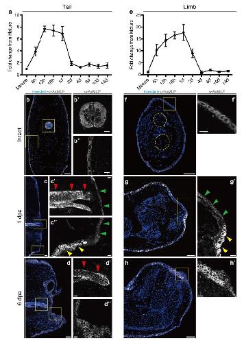 Extended Figure 5. Upregulation of AxMLP transcript during early regeneration and alteration of AxMLP protein localization in wound epidermis cellsMeasurement of AxMLP expression by qPCR at the indicated time points during tail (a) and limb (e) regeneration (n=3: biological replicates; mean±s.d.). To obtain the values of fold-change for each time point, the relative concentration of the PCR products were calculated by the standard curve method. The concentration of AxMLP was normalized with that of Rpl4 (large ribosomal protein 4). b-h, Immunostaining with anti-AxMLP antibody (white) on tails (b-d) and limbs (f-h), of intact (b,f: transverse sections), 1day post amputation (dpa) (c: sagittal; g: horizontal) and 6 dpa (d: sagittal; h:horizontal) samples. By 6 dpa, the epithelial organization and AxMLP expression appeared to be returning to a less tightly adherent, less membrane associated appearance (d-d”,h,h’). Bars in b, c, d, f, g, h, 200 μm; in b’ b” c’ c” d’ d” f’ g’ h’, 50 μm. Red arrowheads in c’d’, indicating spinal cord; Green arrowheads in c’, c”, g’ indicating wound epidermis; Yellow arrowheads in c”, g’ indicating normal epidermis. Yellow circles in f, indicating two bones in the lower limb. |