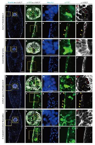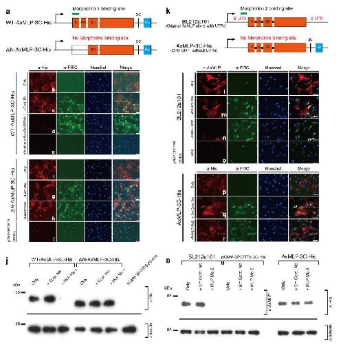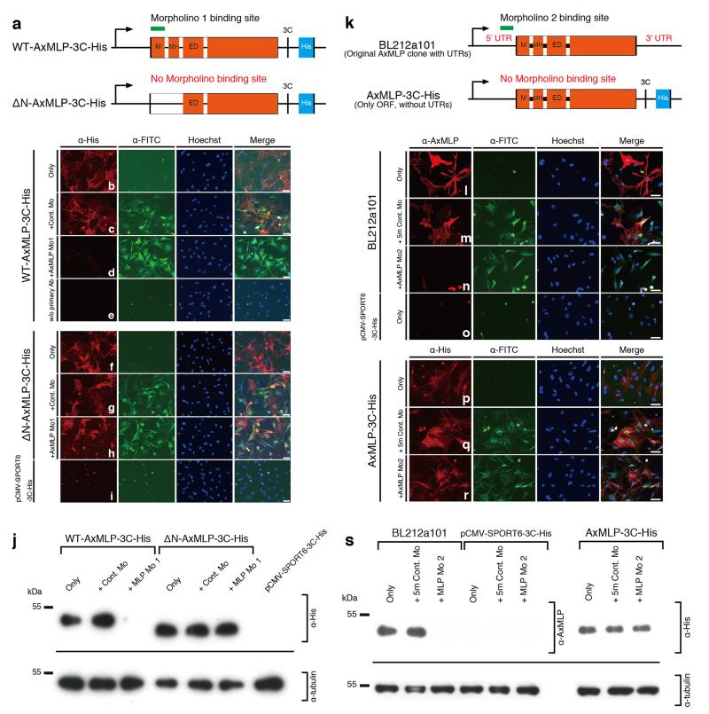 Extended Figure 6. AxMLP morpholinos specifically and efficiently reduce AxMLP translation in cultured cellsa, Schematic illustration of wild type (WT) AxMLP (top) and N-terminal deletion AxMLP (bottom) constructs used to characterize AxMLP Morpholino 1. The N-terminally deleted AxMLP lacks the morpholino binding site. Both constructs have a His-tag on their C-terminus (a). M, Myristoylated N-terminus domain; MH, MARCKS homology domain; ED, Effector domain. b-i, Electroporated A1 myoblasts were stained with indicated markers. b-e, WT-AxMLP plasmid was co-electroporated with the control morpholino (c) or the AxMLP-specific morpholino (d), whereas WT-AxMLP plasmid only (b) or WT-AxMLP only without any primary antibody staining was used as negative controls (e). f-h, ΔN-AxMLP plasmid was co-electroporated with the control morpholino (g) or the AxMLP-specific morpholino (h), whereas ΔN-AxMLP plasmid only (f) or pCMV-SPORT6-3C-His (empty vector) plasmid only served as negative controls (i). j, Western Blotting for the cell lysates from the experiment above. AxMLP morpholino specifically reduced AxMLP protein expression. k, Schematic illustration of the constructs used to characterize AxMLP Morpholino 2. The original AxMLP expression clone from the cDNA library (BL212a101: top) was used as it included the 5’UTR target site for AxMLP Morpholino 2. The sub-cloned AxMLP-His construct lacks the binding site for AxMLP Morpholino 2 and was used as the control construct. l-r, Electroporated A1 myoblasts were stained with indicated markers. l-n, BL212a101 plasmid was co-electroporated with the five-mismatch control morpholino (m) or the AxMLP-specific morpholino 2 (n), or BL212a101 plasmid only (l) or pCMV-SPORT6-3C-His (empty vector) plasmid only served as negative controls (o). AxMLP was detected using an anti-AxMLP antibody (Red), and morpholinos detected via FITC conjugation (Green). p-r, AxMLP-3C-His plasmid was co-electroporated with the five-mismatch control morpholino (q) or the AxMLP-specific morpholino 2 (r) or AxMLP-3C-His plasmid only (p). AxMLP was detected using an anti-His-tag antibody (Red), and Morpholinos detected via FITC conjugation (Green). s, Western Blotting for the cell lysates from the experiment above. AxMLP morpholino 2 specifically reduced AxMLP protein expression. Bars, 100 μm. |