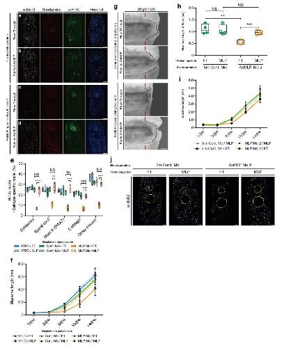 Extended Figure 8. AxMLP is necessary for initial cell proliferation during tail regenerationa-d, Representative transverse sections of the morpholino electroporated/protein injected blastemas that were used for quantification of BrdU incorporation in Fig. 4d. Rhodamine was co-injected with the protein samples. e, Quantification of BrdU+ cells in blastema sections of morpholino electroporated/protein injected tails at 3 dpa (n=4: biological replicates; center values as median; points represent each sample). f, The length of the blastema during tail regeneration. The data at 6 dpa was plotted in Fig. 4c. By 14 days the difference in total regenerate length among the samples was not statistically significant. g-j, The same experimental scheme (shown in Fig. 4a) as was used for AxMLP morpholino 1 was implemented for a second specific morpholino (AxMLP-specific morpholino 2). g, Brightfield images of the morpholino 2 electroporated/protein injected tails at 6 dpa. h, Blastema length at 6 dpa (n=4: biological replicates; center values as median; points represent each sample). i, The length of the blastema during tail regeneration. The data at 6 dpa was plotted in h. j, Transverse sections immunostained for BrdU from morpholino electroporated/protein injected tails at 3 dpa. AxMLP specific morpholino 2 combined with flow-through (FT) injection shows reduction of BrdU incorporation, whereas AxMLP protein injection rescues the phenotype. The corresponding five-mismatch control morpholino does not affect BrdU incorporation. NS, not significant, **P<0.005, ***P<0.0005, ****P<0.00005 with Student’s t-test. Bars in a-d,j, 200 μm; in g, 500 μm. Red bars in g, indicating amputation planes. Dashed lines in g, delineate the shape of the mesenchymal blastema. Yellow circles in j, indicating spinal cord (top) and notochord/cartilage (bottom), respectively. |