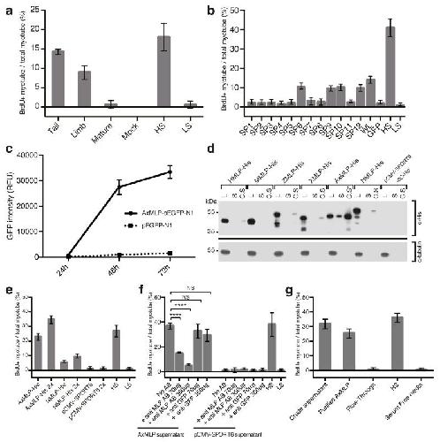 Figure 1. Extracellular AxMLP identified by expression cloning is necessary and sufficient for cell cycle re-entry in vitroa, Supernatants from Xenopus oocytes injected with total mRNA from tail and limb blastema induced robust BrdU incorporation in cultured new myotubes (“Myotube assay”). (n=6: 2 biological, 3 technical replicates each; mean±s.d.). b, A screen for the cell cycle inducing clone. Culture media from HEK293 cells transfected with 6-day tail blastema cDNA library pools and assayed on myotubes for cell cycle induction (see ExFig. 1 for scheme) identified four positive superpools (n=12: 4 biological, 3 technical replicates each; mean±s.d.). Superpool 9 was sib-selected to a single clone, see ExFig. 2. c, AxMLP-GFP fusion protein detection in culture media of transfected HEK293 cells by fluorescence luminometry. (n=3: biological replicates; mean±s.d.). d, MLP orthologs show differing levels of extracellular protein. AxMLP was readily detectable by Western Blotting in cell culture supernatant (S). Human, Zebrafish, Xenopus and Newt MLPs (HMLP, ZMLP, XMLP and NMLP) were only detectable in 40-fold concentrated supernatants (C.S). C.S.*: 5-fold concentrated supernatant. Loading control: anti-tubulin. e. AxMLP and NMLP supernatants both induce myotube cell cycle with response corresponding to protein levels in supernatant (n=6: 2 biological, 3 technical replicates each; mean±s.d.). f. Induction of myotube cell cycle re-entry by AxMLP is specifically blocked by addition of polyclonal anti-AxMLP antibodies to culture supernatant. (n=6: 2 biological, 3 technical replicates each; mean±s.d.). g, Purified AxMLP induces myotube cell cycle re-entry (n=6: 2 biological, 3 technical replicates each; mean±s.d.). SP, superpool; WL, whole library; HS, high serum; LS, low serum. L, cell lysate; S, supernatant. C.S, concentrated supernatant. NS, not significant; ****P<0.0001 with Student’s t-test. |