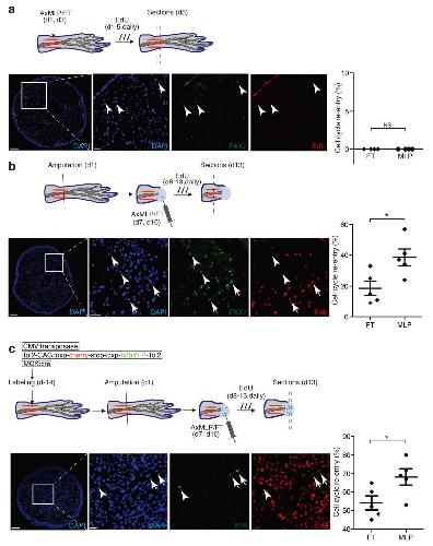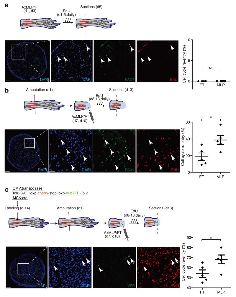 Figure 3. AxMLP induces cell cycle re-entry of muscle-derived cells in newt limba-c top panels, Schematic representation of the experimental paradigm testing the effect of AxMLP on PAX7+ satellite cell proliferation in uninjured limb (a), on PAX7+ satellite cell activation in injured limb (b) or myofiber dedifferentiation after injury (c). a-lower panels: Transverse section of uninjured limb injected with purified AxMLP shows no induction of EdU incorporation. Graph showing no difference in either purified AxMLP or Flow-through (FT) injected uninjured limbs (right side; n=4: biological replicates). b-lower panels: Transverse section of the regenerating limb injected with AxMLP shows increased EdU incorporation of PAX7+ cells. Graph showing more EdU+/PAX7+ satellite cells in AxMLP-injected limbs (right side; n=5: biological replicates; mean±sem). c-lower panels: Transverse section from myofiber-labeled, regenerating limb injected with AxMLP. Graph showing more EdU+/YFP+ myofiber progeny in AxMLP injected blastemas (right side; n=5: biological replicates; mean±sem). NS, not significant; *P<0.05 with Student’s t-test. Bars in lower magnification images, 200 μm; in higher magnification images, 20 μm. Arrowheads indicate marker+/EdU− cells. Arrows indicate marker+/EdU+ cells. |