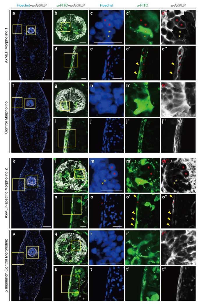 Extended Figure 7. AxMLP morpholinos knockdown endogenous AxMLP in vivoThe morpholinos shown in a-j” were used in Fig. 4 and ExFig. 6a-j,8a-f and the morpholinos shown in k-t” were used in ExFig. 6k-s,8g-j. Transverse sections from AxMLP-specific morpholino 1 (a-e) or control morpholino (f-j) electroporated tail. b, the spinal cord (SC) boxed in a. c-c”, the higher magnification images of the SC boxed in b. AxMLP expression was detected in morpholino negative cells (red asterisks), whereas it was reduced in morpholino positive cells (yellow asterisks). d, the epidermis boxed in a. e-e”, AxMLP expression was unaffected in morpholino negative cells (red asterisks), whereas it was reduced in morpholino positive cells (yellow allowheads). In the control morpholino electroporated tail (f), there was no morpholino specific knockdown phenotype in either SC (g-h”) or epidermis (i-j”). The same experiments were performed with AxMLP specific morpholino 2 (k-o) and the corresponding five-mismatch control morpholino (p-t). The data sets were the same as a-j above. Bars, in a,f,k,p 200μm; in b-e, g,-j, l-o, q-t 50μm. |