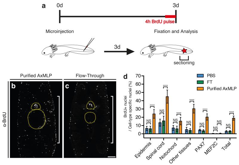 Figure 2. AxMLP is sufficient to induce cell cycle entry in vivoa, Schematic illustration of in vivo protein injection experiment. b,c,Transverse sections of tails injected with purified AxMLP (b) or Flow-through (fraction depleted of AxMLP) (c) immunostained for BrdU. d, Quantification of BrdU+ cells in injected tails. Quantification of BrdU+/PAX7+ cells and BrdU+/MEF2C+ shows that AxMLP induces cell cycle entry in PAX7+ cells (d). NS, not significant; ****P<0.0001 with Student’s t-test, (n=15: 5 biological, 3 technical replicates each; mean±s.d.). Bar in c, 200 μm. White brackets in b, c, indicate injection site. Yellow circles in b, c, indicate spinal cord (top) and notochord (bottom), respectively. |