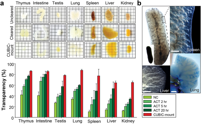 Figure 4. Active Clarity Technique (ACT) for whole-organ clearing and immunolabeling. (a) Cleared organ samples (thymus, intestine, testis, lung, spleen, liver, and kidney) were treated with CUBIC-mount for 5 days to adjust the refractive indices of the tissue and reagent. Square units; x: 5 mm, y: 5 mm. (b) Transmission images of cleared whole organs (liver, lung, kidney, and spleen) by ACT. Images were taken after electrophoretic tissue clearing (ETC) in PBS. Details of the tissue architecture were visualized with a standard dissection microscope. Images were acquired on an Olympus BX53 digital microscope DP73 camera. Scale bar, 1 mm. |