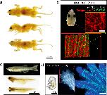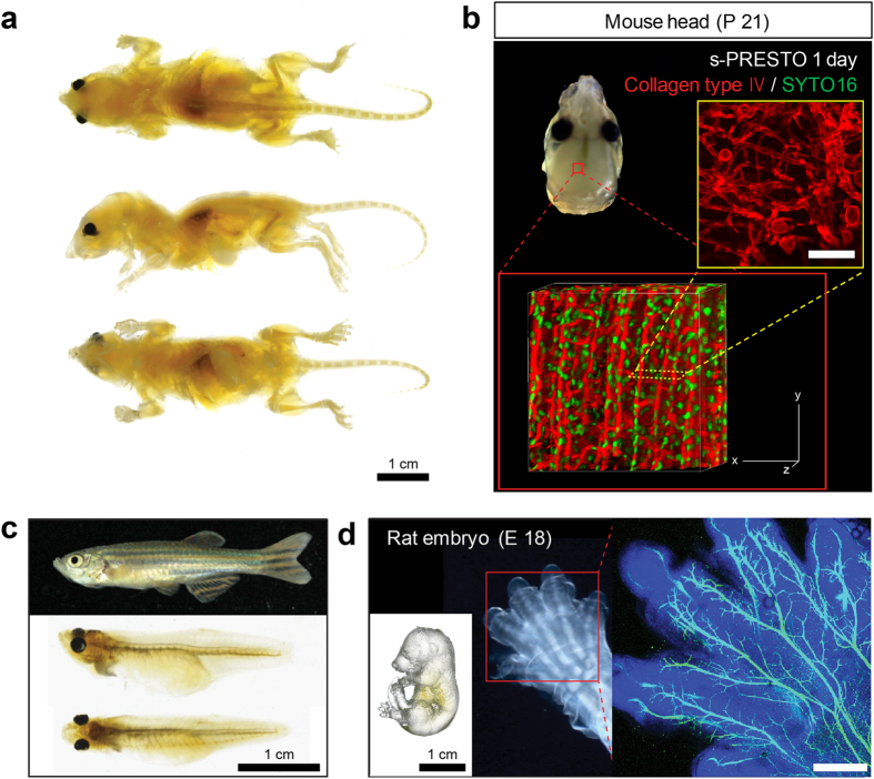 Figure 6. Whole body clearing of various organisms using the Active Clarity Technique (ACT).(a) Whole mouse body (3-weeks-old) was cleared in 24 hours using the ACT. After 3 days of incubation in CUBIC-mount solution, the ACT-processed mouse whole body became optically transparent and could be imaged without sectioning. Scale bar, 1 cm. (b) Image shows collagen type IV-labeled extracellular matrix (ECM) within the skull and underlying meninges. Images were obtained with a Zeiss 700 confocal microscope with a Plan-apochromat 10 ×/0.45 M27 lens, 2 × confocal zoom (stack size, 320 μm; stack step, 5 μm). Scale bar, 100 μm. (c) Comparison of optical transparency of whole zebrafish body before and after ACT clearing. Scale bar, 1 cm. (d) Whole rat embryo body (embryonic day 18) was cleared by the ACT. Scale bar, 1 cm. Embryo labeled with TrkA antibody shows the details of TrkA innervation in the foot. Imaged obtained with a Zeiss 700 confocal microscope with a Plan-Neofluar 5 ×/0.15 objective, 0.7 × confocal zoom (maximum projection; stack size, 1,250 μm; stack step, 15 μm). Scale bar, 500 μm. |