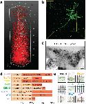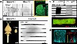 Figure 3, Scalability of the Active Clarity Technique (ACT). (a) Rat brain hemisphere processed with 15 hours of ACT. Scale bar, 1 cm. (Right) Magnified fluorescent image of the boxed region in the middle (yellow). Nuclear-staining (SYTO16) of rat cerebellum (4 × 4 tile scan with the Fluar 5 × objective; stack size, 2,580 μm; stack step, 20 μm) acquired with the LSM 700 microscope. Scale bar, 1 mm. (b) Size comparison of an adult mouse brain and an adult rabbit brain (left). The rabbit brain was cleared after 36 hours of ACT (right). (c, d) Human spinal cord block cleared with ACT and immunolabeled. (c) Before and after ACT. Scale bar, 1 cm. Human spinal cord block (1.3–1.5 cm thick) was cleared (100 hours of ACT) and stained with SMI32 (red). SYTO16 (green) was used for nuclear staining (1.1 × confocal zoom; stack size, 1,020 μm; stack step, 1 μm). (d) Spinal cord block was immunostained for PGP 9.5 (cyan) and collagen type IV (red) (2 × confocal zoom; stack size, 420 μm; stack step, 5 μm). All three-dimensional reconstructed images were obtained with a Zeiss 780 (c) or 700 (d) confocal microscope with a Plan-apochromat 10 ×/0.45 M27 lens. Scale bar, 50 μm. |