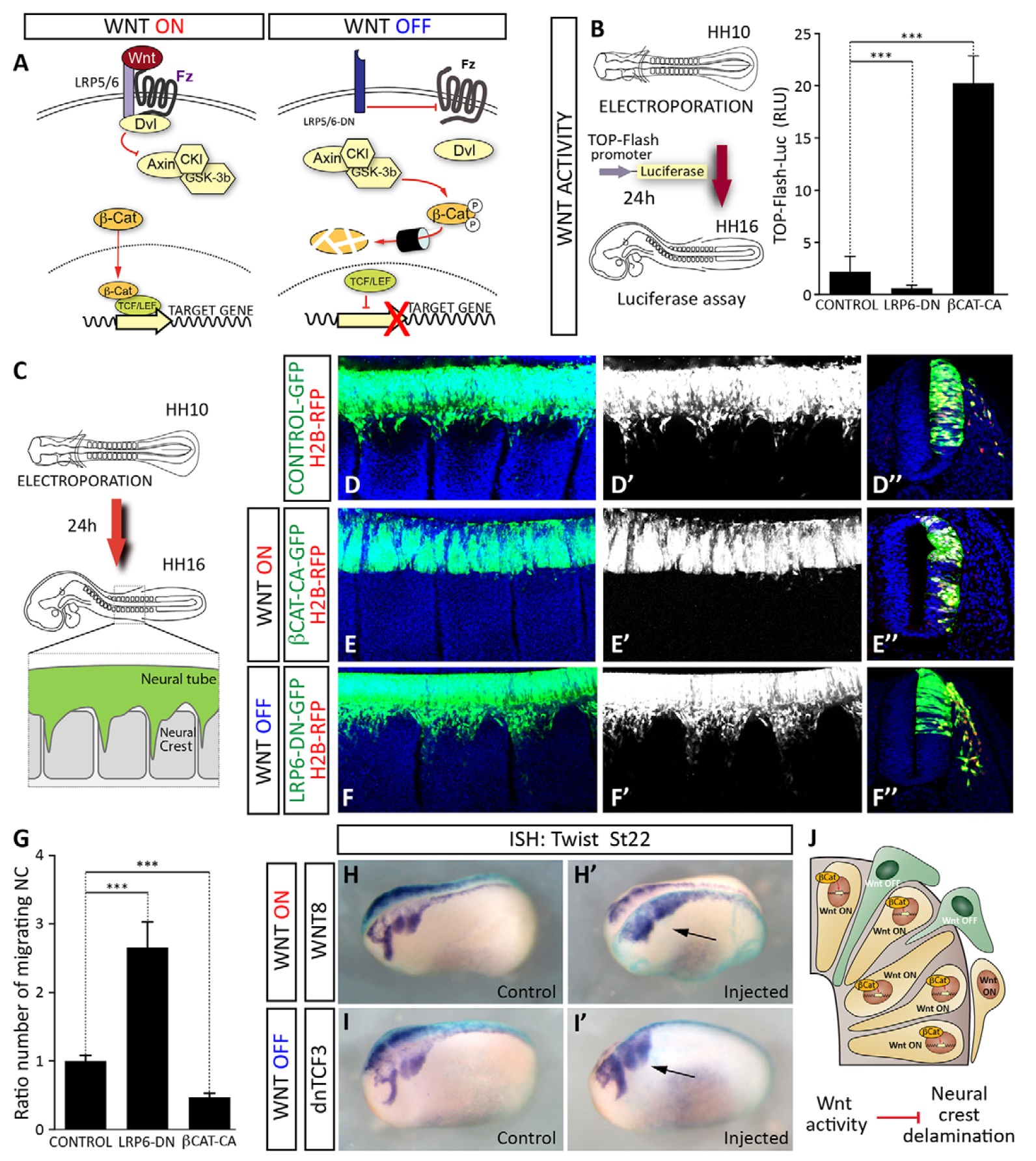 Fig. 2. Inhibition of the Wnt canonical pathway is required for NC delamination. (A) Scheme showing the components of the canonical Wnt pathway. (B) Scheme representing the TOP-Flash electroporation of chick embryos at HH10 for in vivo luciferase assays. Quantification of Luc/Renilla activity 24 hpe with the indicated DNAs. Lrp6DN inhibits and β-catenin-CA activates the TOP-Flash reporter (mean±s.e.m., n=6-10 embryos/condition; ***P<0.001, one-way ANOVA). (C) Scheme showing the location of the transfected cells in chick embryos electroporated at HH10 (reporter GFP expression). (D-F) Selected images of embryos electroporated with DNA at HH10 in which GFP-expressing cell migration was analysed 24 hpe in whole-mount preparations. Lateral view shows the NC streams over 3 somites of the embryos. (Dâ², Eâ²,Fâ²) Selected transverse sections of electroporated NTs showing the migratory NC cells (green) in the three conditions costained with DAPI (blue). (G) Quantification of the EGFP-expressing cells (mean total±s.e.m. after electroporation, n=10-20 sections of â¥4 embryos/condition; ***P<0.001, one-way ANOVA). (H,I) Xenopus laevis embryos injected with RNA encoding Wnt8 (Wnt-ON) or dnTcf3 (Wnt-OFF) were fixed at stage 22. In situ hybridisation for Xenopus twist1 shows that the cephalic NC streams have migrated less on the Wnt-ON injected side of the embryos whereas they have progressed further in the Wnt-OFF injected side of the embryos (nâ¥10/15 embryos/condition). (J) Schematic representation of pre-migratory NC cells in which activation of the Wnt pathway prevents delamination from the dorsal NT. |