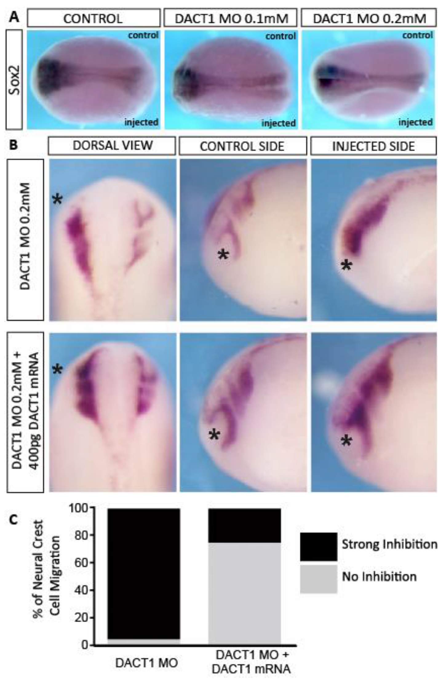 Fig. S3 (related to Figure 4). Loss of DACT1 function in Xenopus embryos in vivo. (A) The DACT1âMO used was as published previously. We used the same morpholinos and reproduced the controls of DACT1-MO by injecting Xenopus laevis embryos with control-MO or DACT1-MO (two concentrations). The embryos were fixed at stage 19 and Sox2 expression was examined by in situ hybridization to show the effects on the NT. (B-C) Specificity of the DACT1-MO was tested by the rescued of NC migration in embryos co-injected with DACT1 (resistant to MO). Xenopus laevis were injected at the 8 cell stage and allowed to develop until the initiation of cephalic NC migration. In situ hybridization for XTwist highlights the reduced migratory cephalic NC streams after DACT1-MO injection and the rescue of NC migration after co-injection with DACT1 mRNA. (C) Quantification showing the percentage NC cell migration in embryos of each experimental condition (n ⥠10/15 embryos/condition). |
