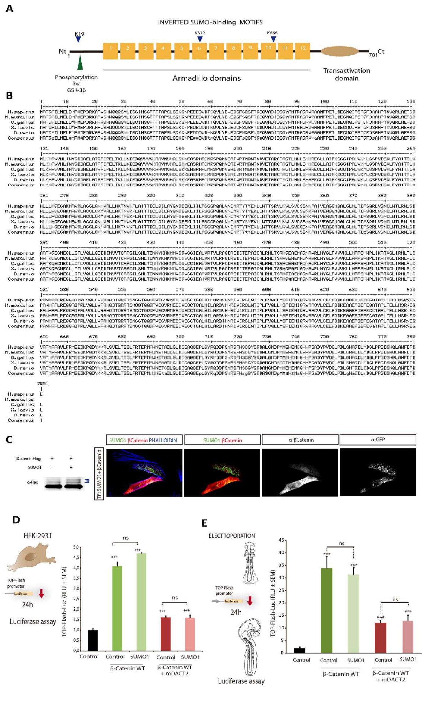 Fig. S6 (related to Figure 7). The -catenin sequence contains three putative SUMO acceptor residues. (A) -catenin contains three putative SUMOylation sites. Schematic representation of the b-catenin protein in which the arrowheads indicate the position of the three putative SUMO acceptor lysines: K19, K312 and K666. (B) Multiple sequence alignment of full length -catenin using Multalin version 5.4.1. Grey squares highlight the conserved lysines (K) located in inverted SUMOylation consensus motifs E/DxKψ. (C) Forced SUMOylation of -catenin was insufficient for the nuclear translocation of -catenin (selected images of HEK-293 cells transfected with the DNAs indicated). In the presence of SUMO-1 (green), -catenin (red) was localized throughout the cell (cytoplasm + nucleus). (D) Forced SUMOylation of b-catenin was insufficient to inhibit the canonical Wnt/-catenin activity. Quantification of Luc/Renilla activity 24 h after transfection of the DNAs indicated into HEK cells. The activation the Top-Flash reporter by -catenin was resistant to the SUMOylation induced by co-transfection of SUMO-1, while -catenin activation of the Top-Flash reporter was inhibited by co-transfection of DACT2. DACT2 mediated inhibition is resistant to SUMO-1 activity. (E) Quantification of Luc/Renilla activity 24 hpe of HH10 chick embryos with the indicated DNAs. As occurred in HEK cells, -catenin activation of the Top-Flash reporter was resistant to SUMOylation induced by the co-transfection of SUMO-1. The activation of the Top-Flash reporter by -catenin was inhibited by co-transfection of DACT2. This DACT2 mediated inhibition is resistant to SUMO-1 activity (mean ±s.e.m., n = 6-10 embryos/condition: ***p<0.001). |