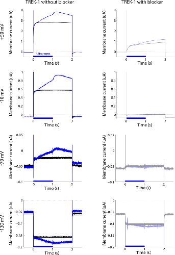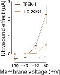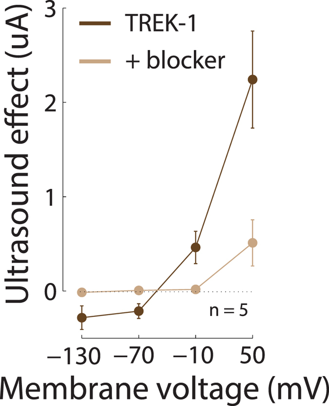 Figure 5. Ultrasound-mediated effects at elevated extracellular K+ concentration.Same format as in Fig. 4 left, for 5 TREK-1 cells recorded in ND96 with a 20 mM K+ concentration. |