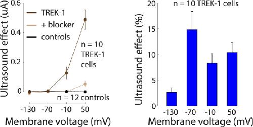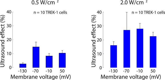 Figure 8. Ultrasound-mediated effects increase with stimulus intensity.Mean ± s.e.m. relative changes in the transmembrane currents due to US, for the individual membrane voltages, quantified in the same interval as previously. The data are shown separately for a lower (left) and a higher (right) stimulus intensity applied to separate sets of cells expressing TREK-1. |