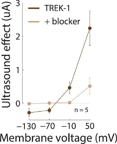Figure 4. The effects of ultrasound on TREK-1 current.Left: Mean ± s.e.m. current due to US as a function of membrane voltage, for TREK-1 cells (dark brown; n = 10), the same TREK-1 cells with BaCl2 (10 mM) in the bath (light brown), and control cells (black; n = 12). The US stimulus pressure amplitude was 120 kPa, corresponding to ISPTA ≈ 0.5 W/cm2. The currents were measured in the same interval as previously. Right: Mean ± s.e.m. relative changes in the transmembrane currents due to US, for the individual membrane voltages, quantified in the same interval as previously. |