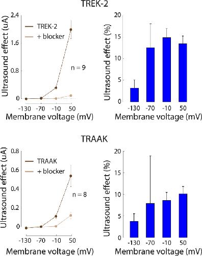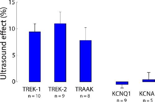 Figure 7. Summary of the effects of ultrasound on K2P channels.Mean ± s.e.m. effects averaged all holding voltages. The values are taken over the same interval as previously. The number of cells are shown below the channel labels. |