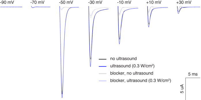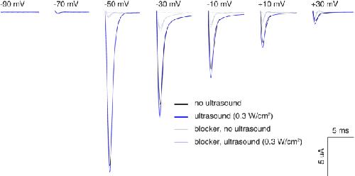 Figure 10. The effects of US on NaV1.5 current.Average membrane current of a cell expressing NaV1.5 α and 81 subunits in response to 20 ms voltage steps of a particular value (see inset). We alternated 4 noUS and 3 US conditions; average noUS (black) or US (blue) current is shown. Pulsed ultrasound (10 MHz, 1 kHz pulse repetition frequency, 50 us pulse duration, ISPTA = 0.3 W/cm2) was applied throughout the US condition (see Methods). The light traces show corresponding currents following the introduction of ranolazine (500 μM), a NaV1.5 channel blocker, into the bath. |