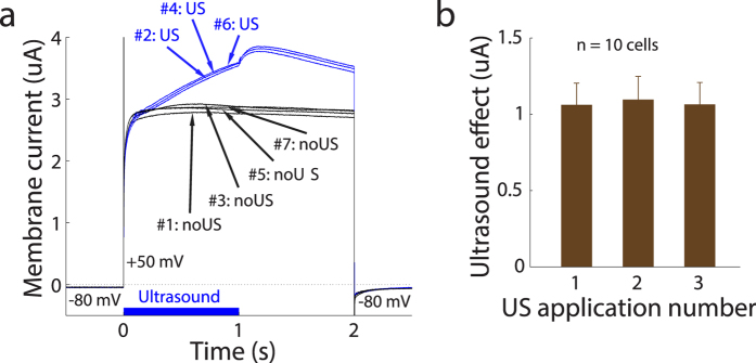 Figure 2. Robust and repeatable effects of ultrasound on transmembrane currents flowing through cells expressing TREK-1.(a) The current flowing through the membrane of an example cell as a function of time. The membrane voltage was held at −80 mV before stepping to +50 mV (time 0). After 2 s, the membrane voltage returned to −80 mV. To test the repeatability of the US effects, we alternated conditions without and with US in the following sequence: #1: noUS, #2: US, #3: noUS, #4: US, #5: noUS, #6: US, #7: noUS with a 5 s period between the repetitions. The corresponding current waveforms are labeled in the figure. In the US conditions, the US was applied at time 0 and lasted 1 s (see blue bar on the bottom). The driving US waveform was sinusoidal with frequency of 10 MHz and spatial-peak pressure amplitude of 240 kPa (2.0 W/cm2). The figure shows the raw recorded currents. (b) Mean ± s.e.m. ultrasound effect, i.e., US minus noUS currents, for the three consecutive applications of the US. The currents were measured between 1.0 s to 1.2 s following the stimulus onset. This plot is based on 10 cells using spatial-peak US pressure amplitude of 240 kPa (2.0 W/cm2) and membrane voltage of +50 mV. |