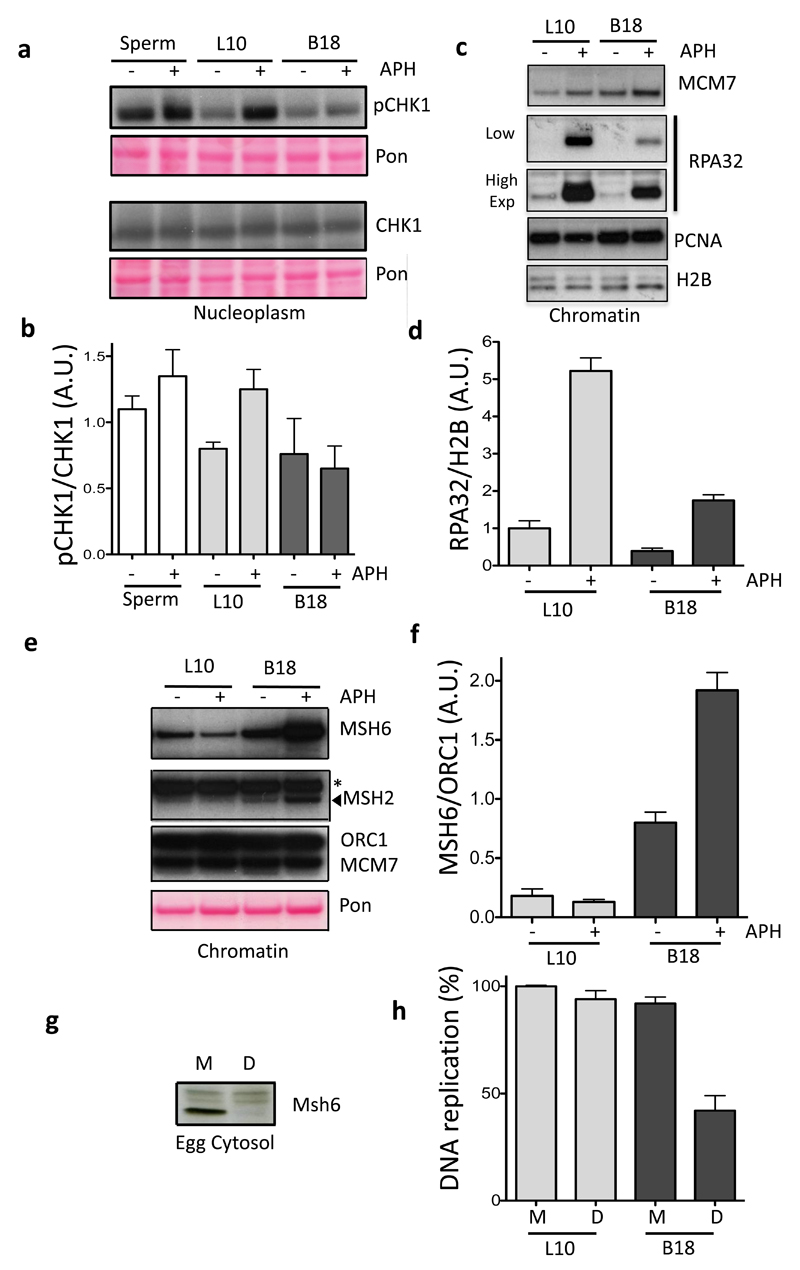 MSH6 antibodies. A typical result is shown. (h) L10 and B18 DNA replication in mock (M) and MSH6 depleted (D) extracts. Relative average percentage of 32PdCTP incorporation is shown. L10 values in mock-depleted extracts were considered 100%. Error bars represent ± sd of the mean. n=3 experiments; p<0.05 when comparing L10 and B18 mean values for Mock (M) and MSH6 depleted extracts (D); One-way Anova.