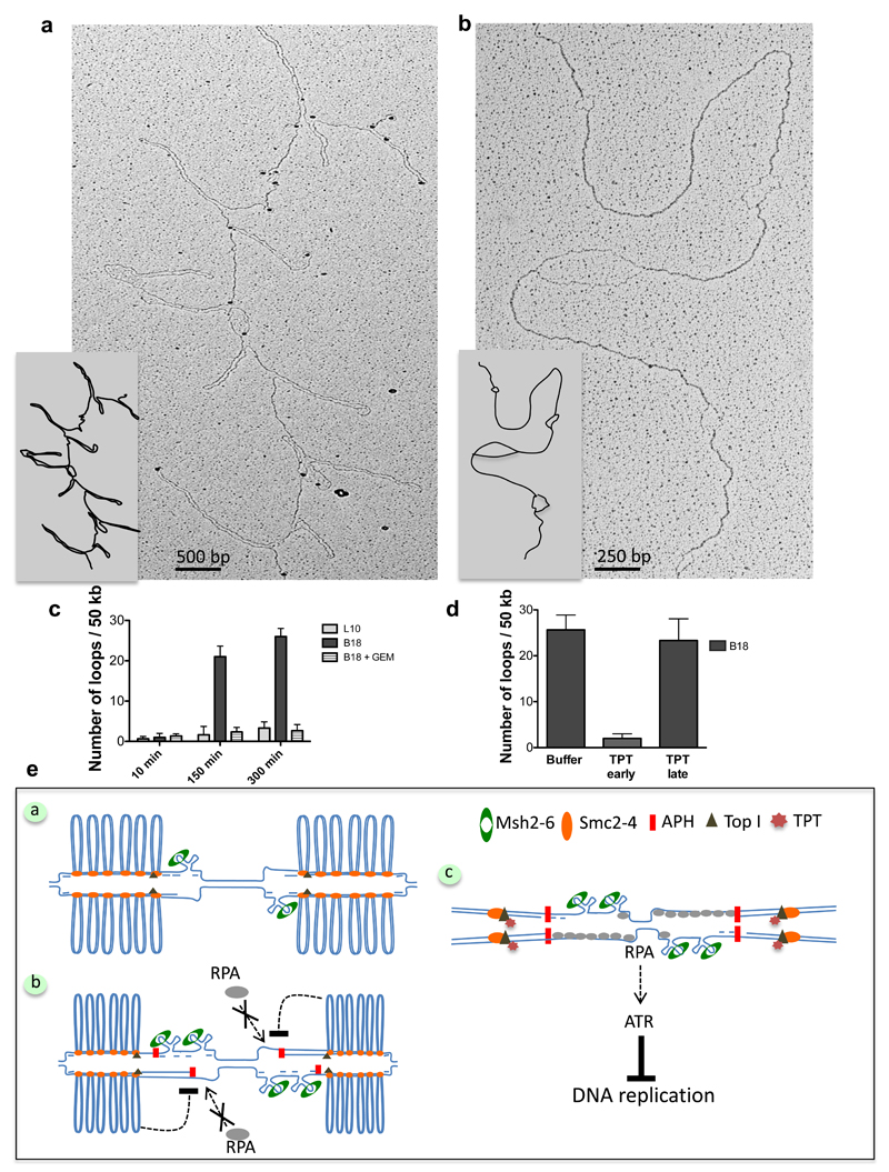 Figure 5. Centromeric BACs generate stable double stranded DNA loops during DNA replication.(a) EM of centromeric B18 chromatin isolated after partial proteinase K digestion (See Methods). (b) EM analysis of samples isolated as in (a) and subjected to complete protein digestion. (c) Graph showing the frequency of DNA loops in L10 or B18 DNA incubated in extracts that were untreated or treated with geminin (Gem) for the indicated times. Experiments were repeated three times scoring the equivalent of about one mega base of DNA in total. Error bars represent ± sd of the mean. n=3 experiments; p<0.001 when comparing L10, B18 and B18 + Gem mean values for the indicated times; One-way Anova. (d) Frequency of loops on B18 DNA incubated in extracts supplemented with buffer or treated with TPT at the start of reaction (TPT early) or after its completion at 300 minutes (TPT late) and collected one hour later. Experiments were repeated three times scoring the equivalent of about one mega base of total DNA. Error bars represent ± sd of the mean. n=3 experiments; p<0.001 when comparing B18 mean values for all treatments; One-way Anova. (e) Model illustrating arrangement and response to replication stress of centromeric chromatin, which is organized in loops of dsDNA formed in the presence of Condensins (SMC2-4) and active Topoisomerase I (Top I). Loops accumulate most likely behind replication forks. Individual centromeric repeats might form hairpins or other secondary structures on unwound ssDNA at replication forks, attracting MMR proteins, which might be required to resolve them (Panel a). This topological arrangement limits the formation of extensive ssDNA regions and RPA hyper-loading onto chromatin triggered by the uncoupling of helicase and polymerase induced by aphidicolin (APH) or other fork stalling events. Inhibition of RPA binding to chromatin prevents activation of ATR. ssDNA generated during fork uncoupling folds into several hairpins, leading to MMR proteins accumulation (Panel b). Interference with contromeric DNA topology by Toposimerase I inhibitor (TPT) restores RPA loading and ATR activity, which inhibits centromeric DNA replication (Panel c), suggesting that topology dependent suppression of ATR normally facilitates replication of hard-to-replicate repetitive DNA sequences present at the centromere.