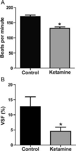 Fig. 4. The effect of ketamine on heart function. a Comparison of the heart rate (beats per minute) in the control and ketamine-treated embryos. nâ=â10. *Pâ<â0.05. b Comparison of ventricular shortening fraction (VSF) in the control and ketamine-treated embryos. nâ=â6. *Pâ<â0.05. The data are expressed as the meansâ±âSD