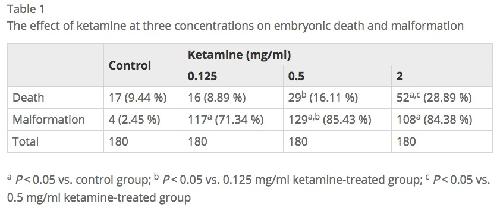 Table 1. The effect of ketamine at three concentrations on embryonic death and malformation.