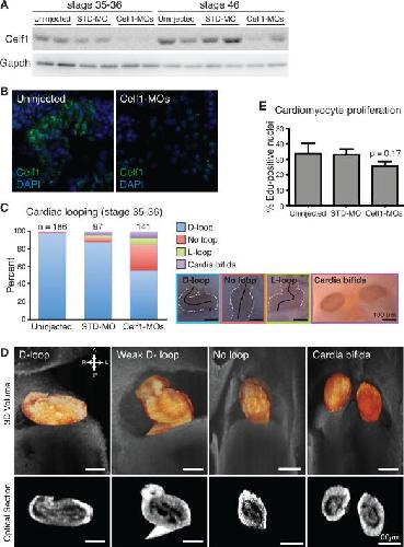 Figure 5. Morpholino-mediated Celf1 knockdown in Xenopus laevis causes cardiac looping defects at stage 35â36. A: Celf1 protein levels were evaluated by Western blot analysis (STD-MO, control morpholino; Celf1-MOs, mix of two celf1-targeting morpholinos). B: Representative images of Celf1 staining in stage 46 heart sections (5â10 sections were stained per embryo for two embryos per group from each of two injection sets, n = 4 total). Control and Celf1-MOs-injected sections were processed simultaneously and imaged at the same exposure settings and time. STD-MO-injected embryos looked similar to uninjected controls (not shown). C: Cardiac looping and cardia bifida were evaluated at stage 35â36. Hearts are outlined with broken white lines; a solid black line indicates the middle of the heart tube. D-loop, dextro-loop; L-loop, levo-loop. D: Tissue overlaying the heart was removed and hearts were imaged in situ by optical coherence tomography (OCT). Three-dimensional reconstructions (top; heart in orange) and optical sections (bottom) are shown. E: The percentage of cardiomyocytes with EdU-positive nuclei was determined. Data are means ± the standard errors of the means of five to six embryos from two to three injection sets. Pairwise comparisons of the means were performed by means of Student's t-test; P value shown for Celf1-MOs-injected group is vs. uninjected. |