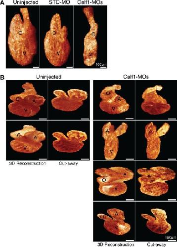 Figure 8. Cardiac dysmorphia following morpholino-mediated knockdown of Celf1 in Xenopus laevis was imaged in situ and ex vivo at stage 46. The hearts of uninjected (n = 9), STD-MO-injected (n = 7), and Celf1-MOs-injected (n = 8) embryos at stage 46 were imaged in situ by optical coherence tomography (OCT), and then removed and imaged by optical coherence microscopy (OCM). A: Representative examples of three-dimensional reconstructions of OCT sections through the hearts are shown. General dysmorphia of the heart and outflow tract can be seen following Celf1 depletion; the atria cannot be resolved in these reconstructions. B: Representative examples of hearts imaged ex vivo using OCM, in intact three-dimensional reconstructions (left) and in cut-away views (right). Multiple hearts from Celf1-MOs-injected embryos are presented to demonstrate the range of dysmorphia observed. Heart reconstructions are shown at equivalent orientations for the purpose of comparison; this orientation does not necessarily match the orientation of the hearts in situ. A, atrium; O, outflow tract; V, ventricle. |