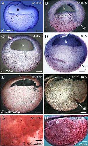 Fig. 1. Immune localization of Mix1 in frog embryos. The animal hemisphere is oriented toward the top. Darkly stained Mix1-positive nuclei were detected in the vegetal hemisphere in embryos of all species. (A, C, E, G, and H) Blastula sections and a bisected blastula in H. (B, D, and F) Sagittal sections of gastrulae with the dorsal side oriented to the right. (A and B) X. laevis embryos. (C and D) E. randi embryos. (E and F) E. machalilla embryos. (G) Vegetal cells of a G. riobambae stage 9.75 blastula. (H) Bisected blastula of E. coqui stage 9.75. The blastocoel roof collapsed during fixation. Cleavage and gastrula embryos of G. riobambae and E. coqui were not analyzed. b, blastocoel; bf, blastocoel floor; dl, dorsal blastopore lip. (Scale bars: A, B, E, and F, 200 µm; C and D, 150 µm; G, 100 µm; H, 400 µm.)
