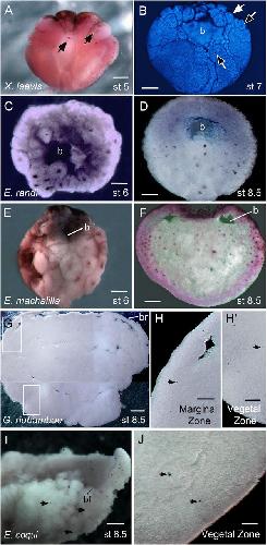 Fig. 2. Immune localization of VegT in frog embryos. The animal hemisphere is oriented toward the top. Darkly stained VegT-positive nuclei were detected in the animal and vegetal hemispheres in the embryos of all species and only the uppermost area of the animal pole was VegT-negative. (A and B) Embryos of X. laevis. (A) Parasagittal section of a st 5 embryo. VegT-positive nuclei were observed in animal and vegetal cells. (B) VegT immune localization and Hoechst 33258 fluorescence of a bisected blastula. The dark color of VegT-positive reaction quenched Hoechst 33258 nuclear fluorescence in animal and vegetal cells, whereas VegT-negative nuclei were brightly fluorescent. (C and D) E. randi embryos. (E and F) Embryos of E. machalilla. The blastocoel roof collapsed during embryo fixation in F. (GâHâ²) An embryo of G. riobambae. (G) Panoramic view of a st-8.5 embryo section. The figure is a composite of multiple images. Areas of the marginal and vegetal regions are boxed and shown at higher magnification in H and Hâ² to show VegT-positive nuclei. (H) Marginal zone. (Hâ²) Vegetal region. (I and J) E. coqui embryos. (I) Bisected blastula. VegT-positive nuclei were observed in the marginal zone and vegetal region. (J) Vegetal region from a st-8.5 embryo at higher magnification. VegT-positive nuclei are visible. Black arrows in A, B, H, Hâ², I, and J point to VegT-positive nuclei. White arrow in B points to a VegT-negative nucleus. b, blastocoel; bf, blastocoel floor; br, blastocoel roof. (Scale bars: A, B, and F, 200 µm; C and D, 150 µm; E, 250 µm; G and I, 300 µm; H, Hâ², and J, 100 µm.)