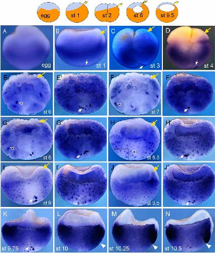 Fig. 3. vegt mRNA localization in X. laevis embryos. The animal hemisphere is oriented toward the top. In all embryos, dorsal is oriented to the right. Embryos were dorsally hemibisected before in situ hybridization. The row of diagrams summarizes the vegt expression of the unfertilized egg and st 1â9.5 embryos. The animal hemisphere of the egg and the blastocoel roof (shown in gray) were vegt-negative and the vegetal region (in orange) was vegt-positive. (A) The unfertilized egg. vegt mRNA was found in the vegetal hemisphere with a lower concentration toward the animal region. (B) The egg 1 h after fertilization. vegt mRNA was detected in the vegetal hemisphere with a displacement toward the dorsal-animal side. In addition, vegt transcripts were detected in irregular areas located at the vegetal pole and colocalized with the germ plasm. Germ plasm and mitochondria localization are shown in Fig. S4 EâG. (C) The four-cell embryo. (D) The eight-cell embryo. (EâK) Blastulae. (LâN) Gastulae. (EâJ) Lightly stained halfâblastulae after vegt in situ hybridization. vegt mRNA localized mainly around the nuclei of vegetal cells. The boxed area in H is shown at higher magnification in Fig. S2B. (Eâ²âJâ²) Darkly stained half-blastulae after in situ hybridization. The dark color of the embryos partially masked the vegt mRNA signal around nuclei in Eâ²âGâ² in comparison with the lightly stained half blastulae in EâG. Yellow arrows indicate the dorsoâanterior limit of vegt mRNA localization. White arrows at the vegetal region mark the accumulation of vegt transcripts in the germ plasm. Black arrowheads point to the accumulation of vegt transcripts in the central region of vegetal blastomeres. White arrowheads indicate the position of the dorsal blastopore lip.