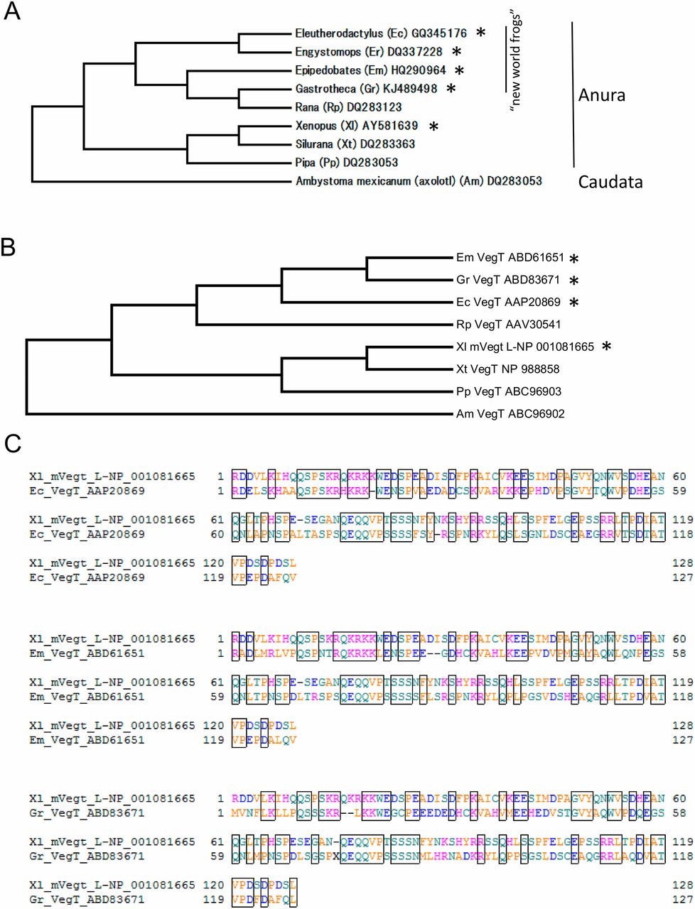 Fig. S1. Phylogenetic tree of genera and comparisons of the X. laevis epitope sequence for anti-VegT polyclonal ab with the vegt sequences of other frogs. (A) Phylogenetic tree of genera from maximum likelihood analysis of mitochondrial DNA using MEGA8. The sequences included were ribosomal RNA genes (S16 and 12S) and tRNA-Val gene. In case of G. riobambae, only the 16S ribosomal RNA gene was used, modified from ref. 19. (B) Phylogenetic tree of VegT epitopes using the MEGA8, mitochondrial DNA method. The vegt sequence of E. randi is unknown. (C) Sequence aligment of E. coqui (Ec), E. machalilla (Em), and G. riobambae (Gr) against X. laevis (Xl). Sequences were aligned by using the ClustalW multiple sequence alignment. Identical residues are boxed. *Epitope sequences analyzed in this study.