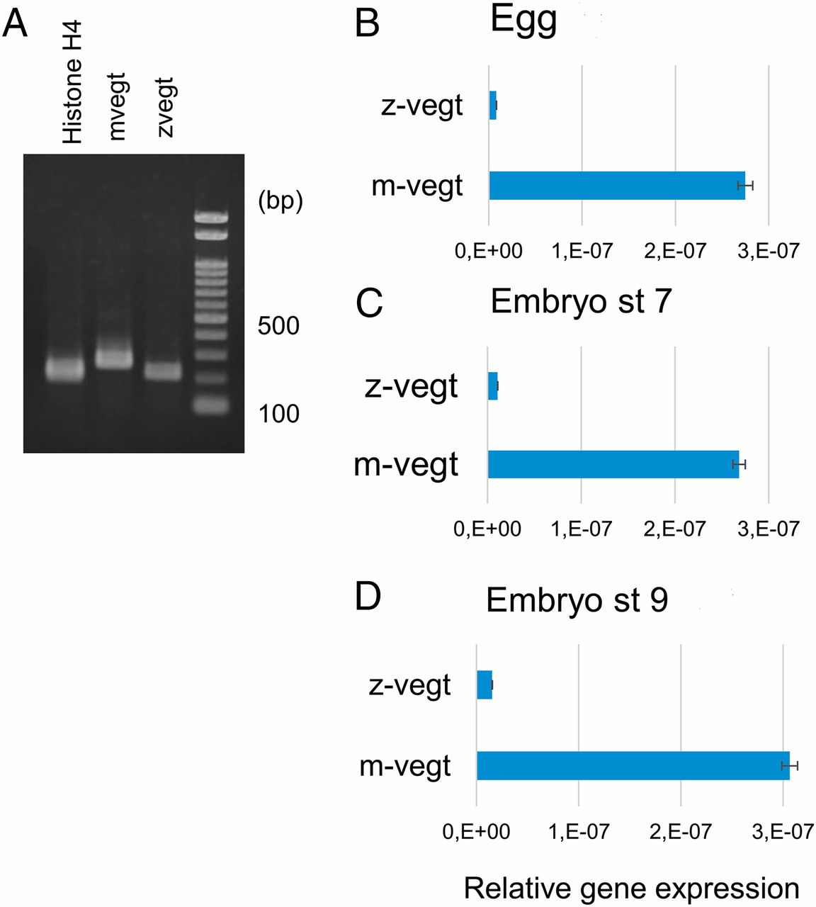 Fig. 4. vegt mRNA isoforms of the X. laevis unfertilized egg and embryos. (A) vegt mRNA isoforms of the unfertilized egg amplified by RT-PCR and separated in an agarose gel. (BâD) Relative expression of mvegt and zvegt by RT-qPCR and δδCt analysis normalized by histone H4 expression. (B) Unfertilized egg. (C) Embryo st 7. (D) Early st 9 embryo. The ratios of zvegt mRNA to mvegt mRNA were 2.8% in B, 4.0% in C, and 5.2% in D. The efficiency of mvegt and zvegt primer sets is almost the same. The results are the means of three independent experiments.