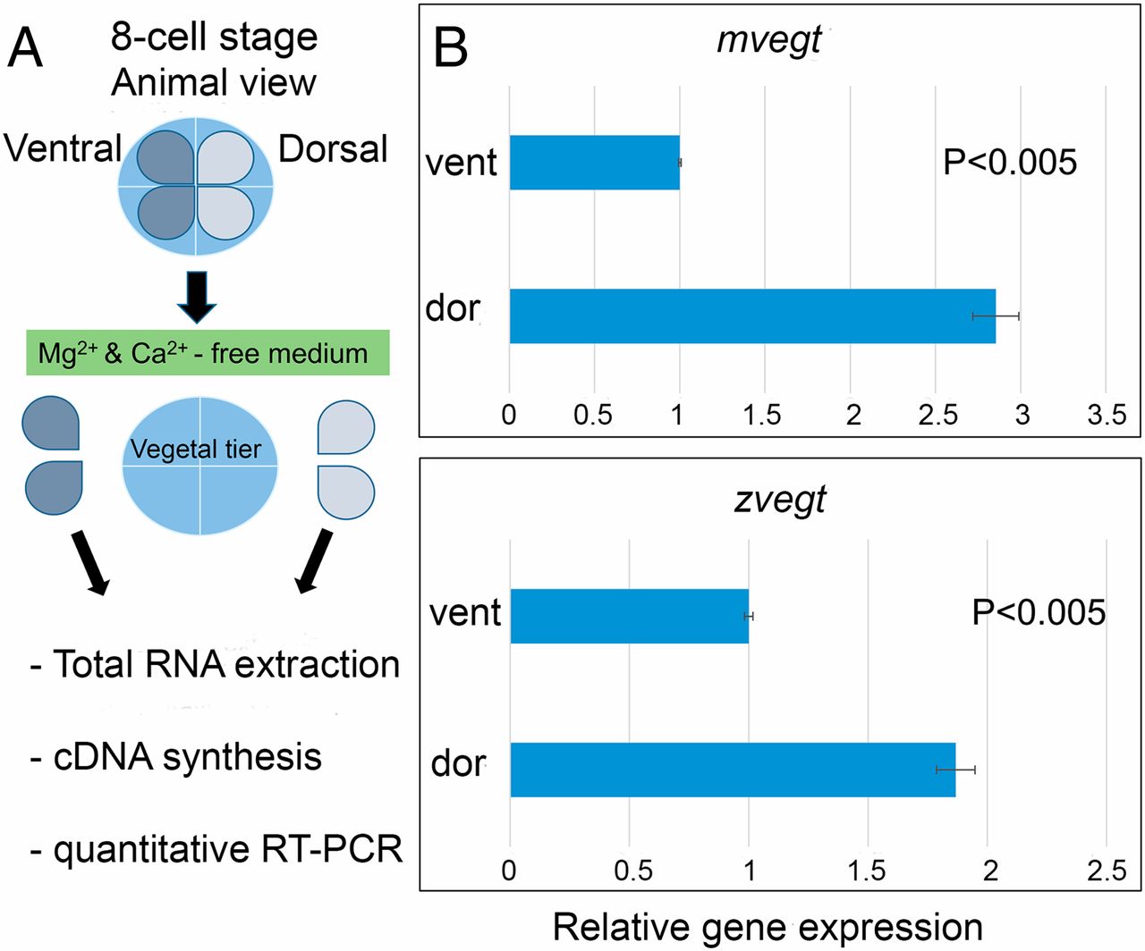 Fig. 5. Dorsoventral relocalization of vegt mRNA in animal blastomeres of eight-cell stage embryos (st 4) of X. laevis. (A) Outline of the methods. (B) Quantitation of mvegt and zvegt expression by RT-qPCR in animal blastomeres, normalized by the expression of histone H4. The data show the results of three independent experiments. dor, dorsal; P, statistics P value; vent, ventral.